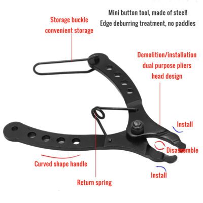 This bicycle chain pliers features a storage buckle design, making it easy to carry and providing convenience for daily riding. The bicycle chain pliers has a bidirectional arc design handle that is ergonomic for comfortable use and helps apply the correct force – simple and labor-saving. Made of high-quality steel material, it is lightweight and can be put into backpacks for easy storage, making outdoor cycling more comfortable. Suitable for chains with a buckle interface, it is used for daily chain cleaning and maintenance or replacement of new and old chains.